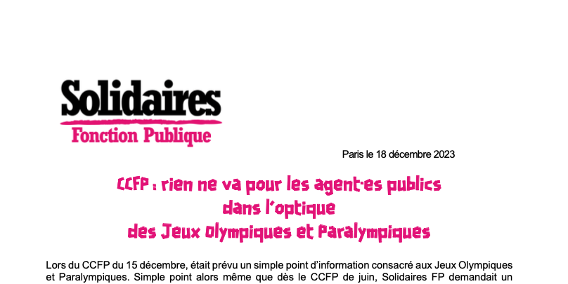 Lors du CCFP du 15 décembre, était prévu un simple point d’information consacré aux Jeux Olympiques et Paralympiques. Simple point alors même que dès le CCFP de juin, Solidaires FP demandait un véritable cycle de groupes de travail permettant d’aborder les problématiques en lien avec les conséquences des JOP notamment sur les conditions de travail des agent·es. Demande renouvelée depuis par courrier.