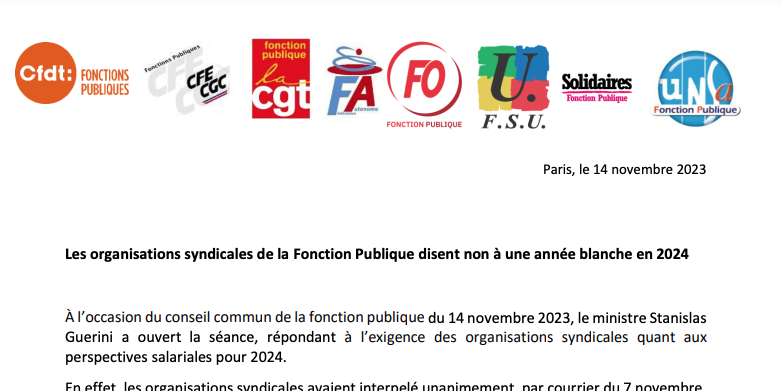 En effet, les organisations syndicales avaient interpelé unanimement, par courrier du 7 novembre, le Ministre sur la nécessité de nouvelles mesures générales portant sur les salaires et la revalorisation des carrières. Elles insistaient, notamment, sur le fait que 2024 ne pouvaient pas être une année blanche face à la persistance d’une inflation soutenue.