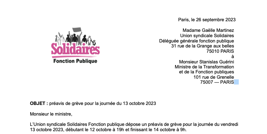 L’Union syndicale Solidaires Fonction publique dépose un préavis de grève pour la journée du vendredi 13 octobre 2023, débutant le 12 octobre à 19h et finissant le 14 octobre à 9h.