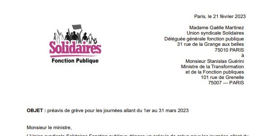 L’Union syndicale Solidaires Fonction publique dépose un préavis de grève pour les journées allant du 1er au 31 mars 2023 (de 0 h à 24 h).