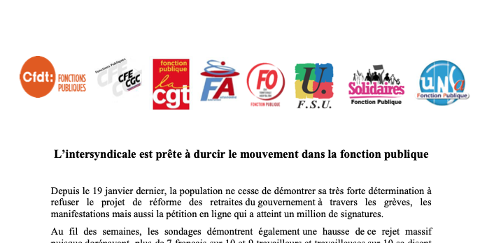 Si malgré tout le gouvernement et les parlementaires restaient sourds à la contestation populaire, les organisations de la fonction publique appellent, dans le cadre interprofessionnel, à durcir le mouvement et à mettre la France à l’arrêt dans tous les secteurs le 7 mars prochain.