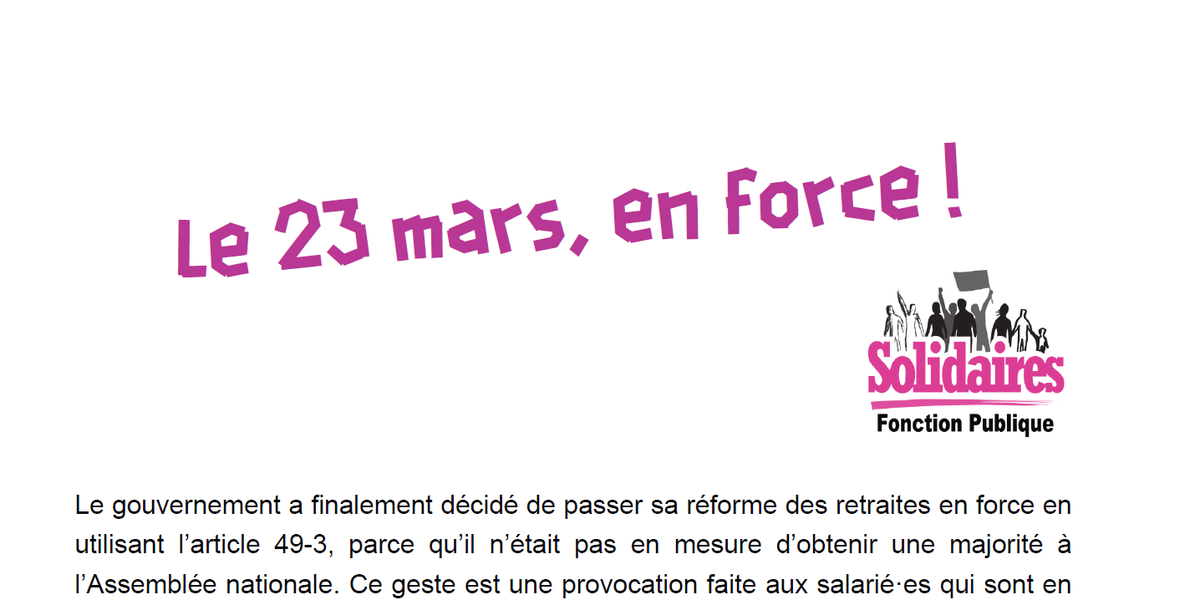 Le gouvernement a finalement décidé de passer sa réforme des retraites en force en utilisant l’article 49-3, parce qu’il n’était pas en mesure d’obtenir une majorité à l’Assemblée nationale. Ce geste est une provocation faite aux salarié·es qui sont en grève depuis le mois de janvier, y compris de façon reconductible.