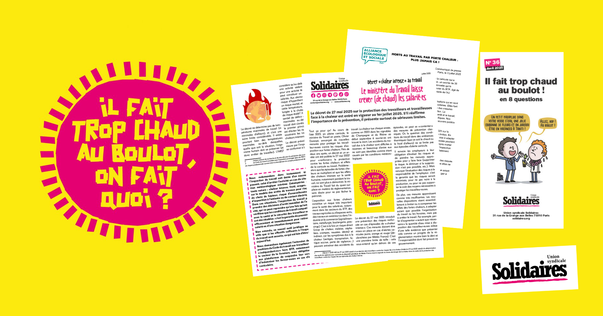 > Communiqué de l’Alliance écologique et sociale - Morts au travail par forte chaleur : plus jamais ça ! > Décret « chaleur intense » au travail Le ministère du Travail laisse crever (de chaud) les salarié·es > Pétition - Budget : les sacrifices pour le monde du travail ça suffit ! > NON à la destruction par la France des contraceptifs payés par l'USAID - pétition