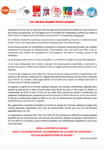 > Mobilisation nationale, rendez-vous le 29 avril ! Contre les politiques migratoires du gouvernement et contre l'opération Wuambushu à Mayotte ! > Un 1er mai 1995, au nom d’une idéologie fasciste, Brahim BOUARRAM a été exécuté, jeté dans la Seine 28 ans après, où en est-on ? > Tribune collective “Alerte sur les libertés associatives” > [Vidéo] Simon Duteil répond sur BFM à Macron au Stade de France, Borne et les syndicats, la suite de la mobilisation retraite... > [Vidéo] Intervention BFM le 25 avril d'Aurélien Boudon sur les casserolades et les déplacements de l'exécutif > [Tribune Médiapart] Pour la régularisation des Sans-Papiers de Chronopost et DPD en grève depuis 16 mois > Message du Collectif syndical français aux ‎travailleuses et travailleurs d’Iran‎ à l’occasion du 1er mai 2023 > Nous dénonçons l’opération de police lancée par le gouvernement turc > SUD Rail - (intersyndical) Fret SNCF : nous ne laisserons pas faire ! > SUD Rail - Dépôt de plainte de notre camarade mutilé le 23 mars > SUD Santé Sociaux - Catégorie active en voie d'extinction, saisine des cours européennes > Solidaires Informatique lance le concours des 100 jours de zbeul ! > SUD Industrie - Déclaration à l'occasion de la journée du 28 avril > UNIRS - (unitaire) Les retraité·es appellent au 1er mai > Solidaires Seine Maritime - Au Havre le 1er mai contre la venue de Le Pen > Solidaires Loiret : tract de la Commission Femmes et Discriminations de Solidaires Loiret pour le mois de mai. > Solidaires Côte-d'Or - (unitaire) Stop au mal logement et à l'explosion des prix des loyers ! > Solidaires Aude - Carcassonne 28 avril : Déambulation à vélo pour affirmer le droit à la santé et à la sécurité au travail > Solidaires Auvergne - 24 Avril : on reconduit la casserolade > Solidaires Allier - Contre Macron et son monde : Casserolade générale lundi 24 avril à 20h sur l'Allier > Solidaires Allier - Face au rejet et à la haine exrimés par les militants du RN, Solidarité avec les migrant-es > Tract VISA pour le 1er mai : Contre la réforme des retraites de Macron et contre l'extrême droite !