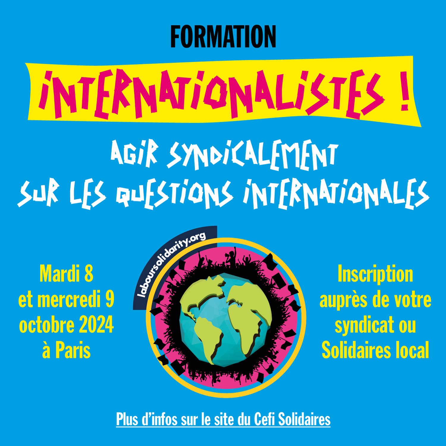 Internationalistes. Agir syndicalement sur les questions internationales Journée de formation, avec une présentation du travail de la commission Internationale, des différents groupes de travail (Palestine, Ukraine, Kurdistan, Chiapas), du Réseau Syndical International de Solidarité et de Luttes. Nous donnerons les outils permettant d'intervenir sur l'internationalisme sur le lieu de travail et de développer la place de l'internationalisme dans les syndicats. Programme MATIN (9H30 - 12H30) → Présentation et échanges autour des travaux de la commission internationale et des différents groupes de travail : Palestine, Kurdistan, Chiapas, Ukraine et du Réseau Syndical International de Solidarité et de Luttes (RSISL) APRÈS-MIDI (14H - 17H) → Ateliers par secteurs : internationalisme sur le lieu de travail : éducation, santé-social, rail,...et par thématiques : femmes, écologie, autogestion, convois… → Plénière : développer l'internationalisme dans nos syndicats