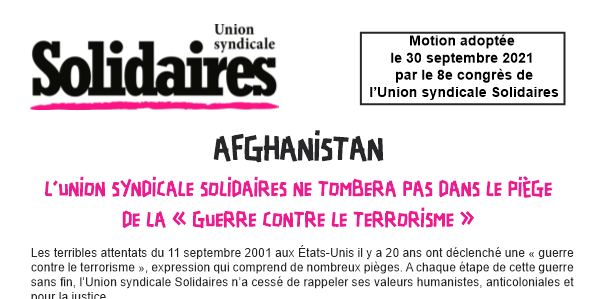 Les terribles attentats du 11 septembre 2001 aux États-Unis il y a 20 ans ont déclenché une « guerre contre le terrorisme », expression qui comprend de nombreux pièges. A chaque étape de cette guerre sans fin, l’Union syndicale Solidaires n’a cessé de rappeler ses valeurs humanistes, anticoloniales et pour la justice.