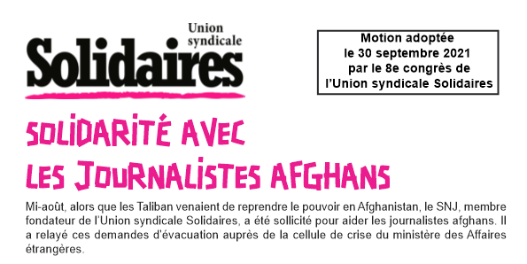 Mi-août, alors que les Taliban venaient de reprendre le pouvoir en Afghanistan, le SNJ, membre fondateur de l’Union syndicale Solidaires, a été sollicité pour aider les journalistes afghans. Il a relayé ces demandes d'évacuation auprès de la cellule de crise du ministère des Affaires étrangères.