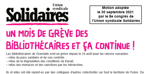 Les bibliothécaires de Grenoble et de nombreuses villes appellent donc l’ensemble de la profession, à travers la France, à faire grève vendredi 1er octobre, pour dire : “NON AU CONTRÔLE DU PASS SANITAIRE EN BIBLIOTHÈQUES !“.