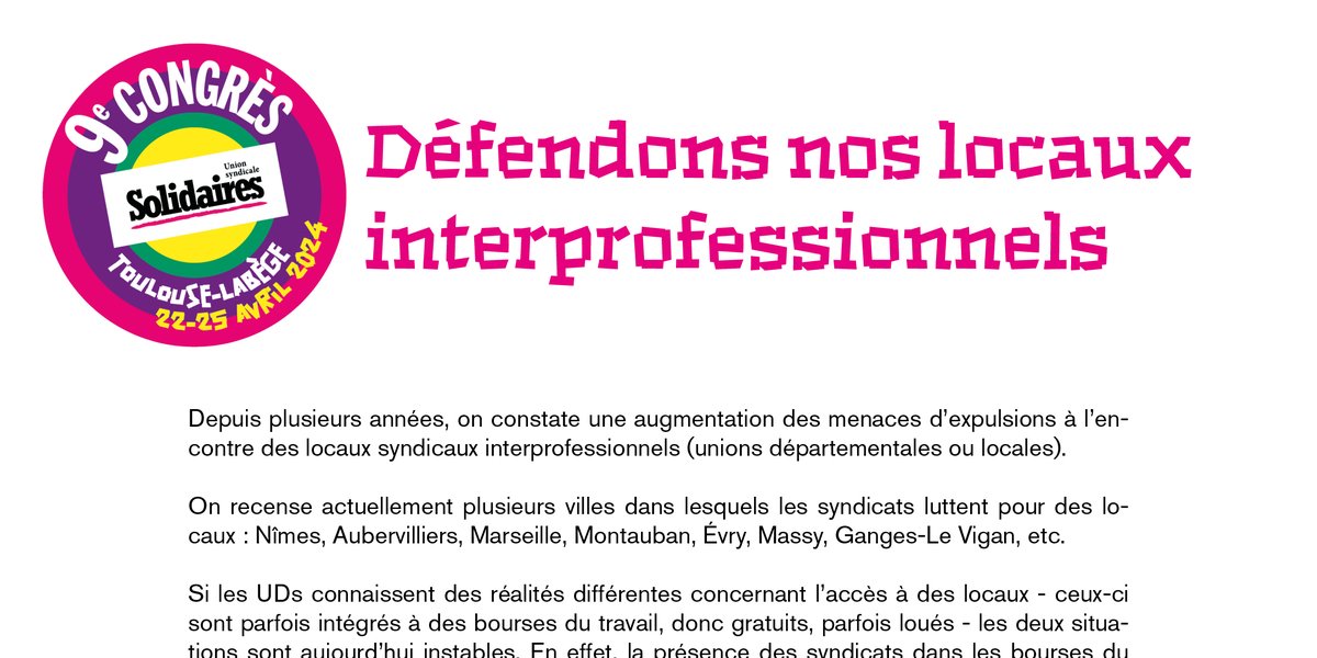 Avec l’objectif affiché de renforcer le travail interprofessionnel, Solidaires s’engage dans un vrai processus collectif de mise en commun, de réflexions, d’accompagnement et de luttes – si nécessaire juridiques - concernant l’accès et le fait de pouvoir user de locaux d’organisation.