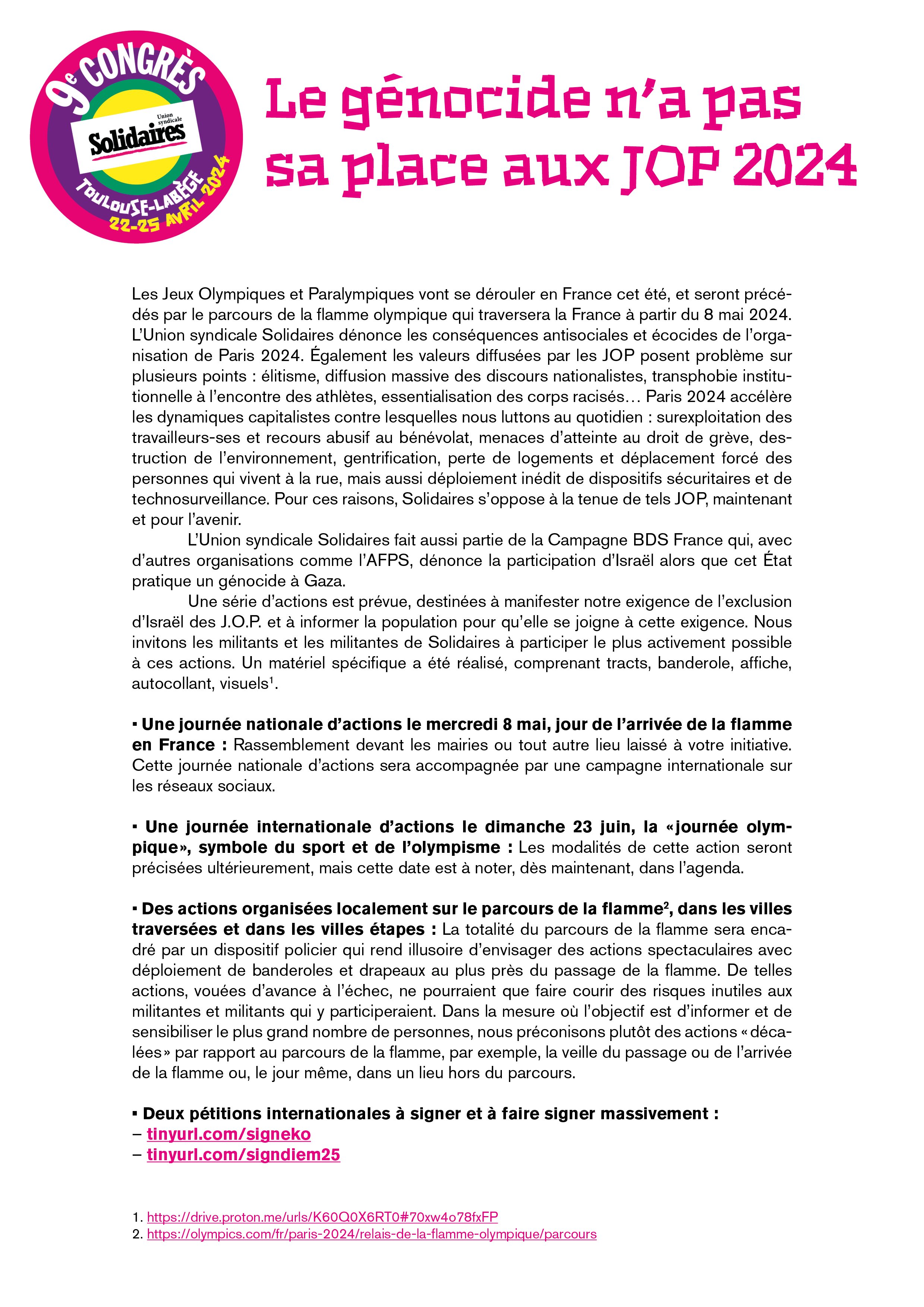 Une série d’actions est prévue, destinées à manifester notre exigence de l’exclusion d’Israël des J.O.P. et à informer la population pour qu’elle se joigne à cette exigence. Nous invitons les militants et les militantes de Solidaires à participer le plus activement possible à ces actions. Un matériel spécifique a été réalisé, comprenant tracts, banderole, affiche, autocollant, visuels1.
