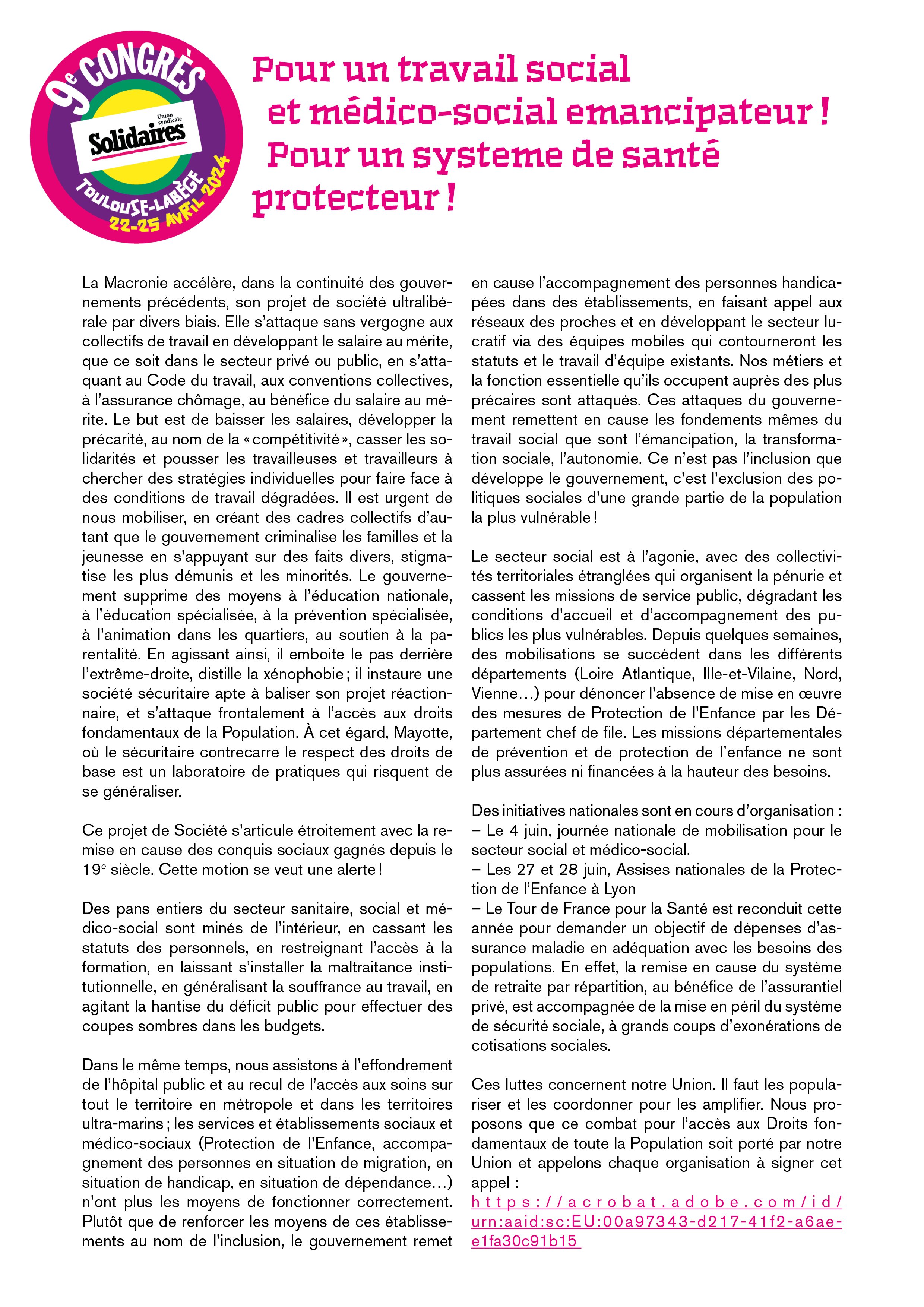 Dans le même temps, nous assistons à l’effondrement de l’hôpital public et au recul de l’accès aux soins sur tout le territoire en métropole et dans les territoires ultra-marins ; les services et établissements sociaux et médico-sociaux (Protection de l’Enfance, accompagnement des personnes en situation de migration, en situation de handicap, en situation de dépendance…) n’ont plus les moyens de fonctionner correctement. Plutôt que de renforcer les moyens de ces établissements au nom de l’inclusion, le gouvernement remet en cause l’accompagnement des personnes handicapées dans des établissements, en faisant appel aux réseaux des proches et en développant le secteur lucratif via des équipes mobiles qui contourneront les statuts et le travail d’équipe existants. Nos métiers et la fonction essentielle qu’ils occupent auprès des plus précaires sont attaqués. Ces attaques du gouvernement remettent en cause les fondements mêmes du travail social que sont l’émancipation, la transformation sociale, l’autonomie. Ce n’est pas l’inclusion que développe le gouvernement, c’est l’exclusion des politiques sociales d’une grande partie de la population la plus vulnérable !