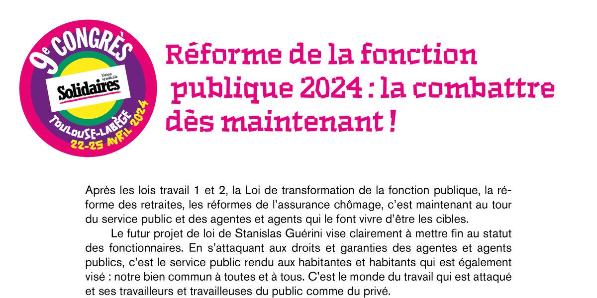 Le futur projet de loi de Stanislas Guérini vise clairement à mettre fin au statut des fonctionnaires. En s’attaquant aux droits et garanties des agentes et agents publics, c’est le service public rendu aux habitantes et habitants qui est également visé : notre bien commun à toutes et à tous. C’est le monde du travail qui est attaqué et ses travailleurs et travailleuses du public comme du privé.