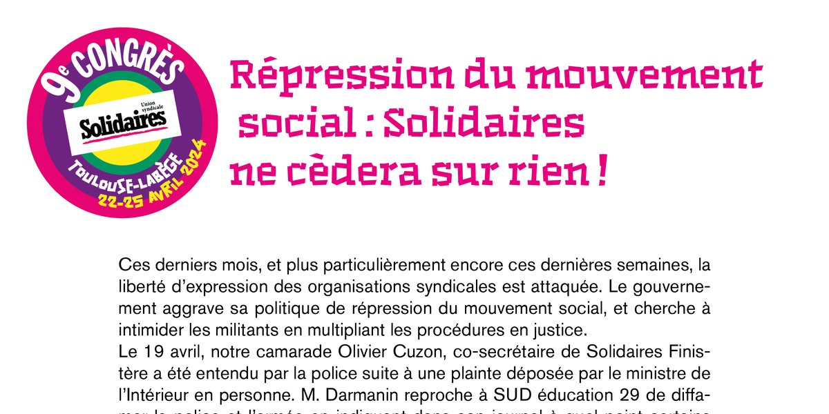 Le congrès de l’Union syndicale Solidaires affirme solennellement son soutien aux camarades inquiété·es et faisant l’objet de la répression des autorités de l’État, et s’associera aux initiatives unitaires en défense des libertés fondamentales.