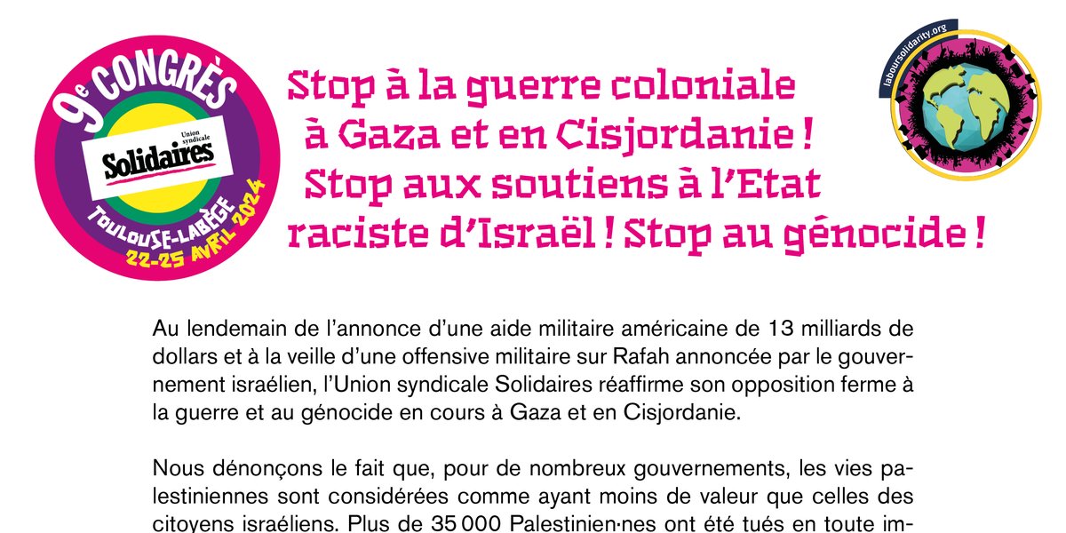 Nous saluons les camarades syndicalistes palestiniens présents lors de notre congrès et nous engageons à continuer à tisser les liens de la solidarité internationale. Nous répondrons présent·es à la demande de nos organisations sœurs en Palestine qui appellent à investir massivement les manifestations du premier mai et celles du 15 mai qui se dérouleront à l’occasion de la date anniversaire de la nakba pour appeler à la cessation immédiate du conflit et du génocide en cours.