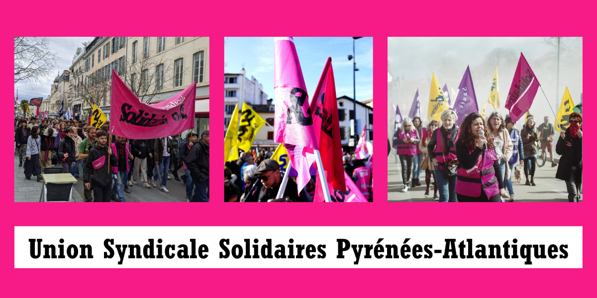 L’Union syndicale Solidaires 64 rassemble les syndicats SUD et Solidaires des Pyrénées-Atlantiques. Elle défend les travailleuses et les travailleurs, quelle que soit leur origine, leur culture, leur genre ou leur statut : du public, du privé, en formation, sans emploi ou à la retraite. Solidaires porte un syndicalisme de lutte pour transformer la société, afin d'en mieux partager les richesses et le temps de travail, afin d’œuvrer à une société plus juste, respectueuse de l'environnement, fondamentalement démocratique, luttant contre l'arbitraire et l'exclusion économique et sociale. Pour une société émancipée des rapports économiques et politiques de domination, œuvrant pour l'intérêt général et satisfaisant tous les besoins collectifs au service de toutes et tous. Solidaires est indépendant des patrons, de l'Etat et des organisations politiques.