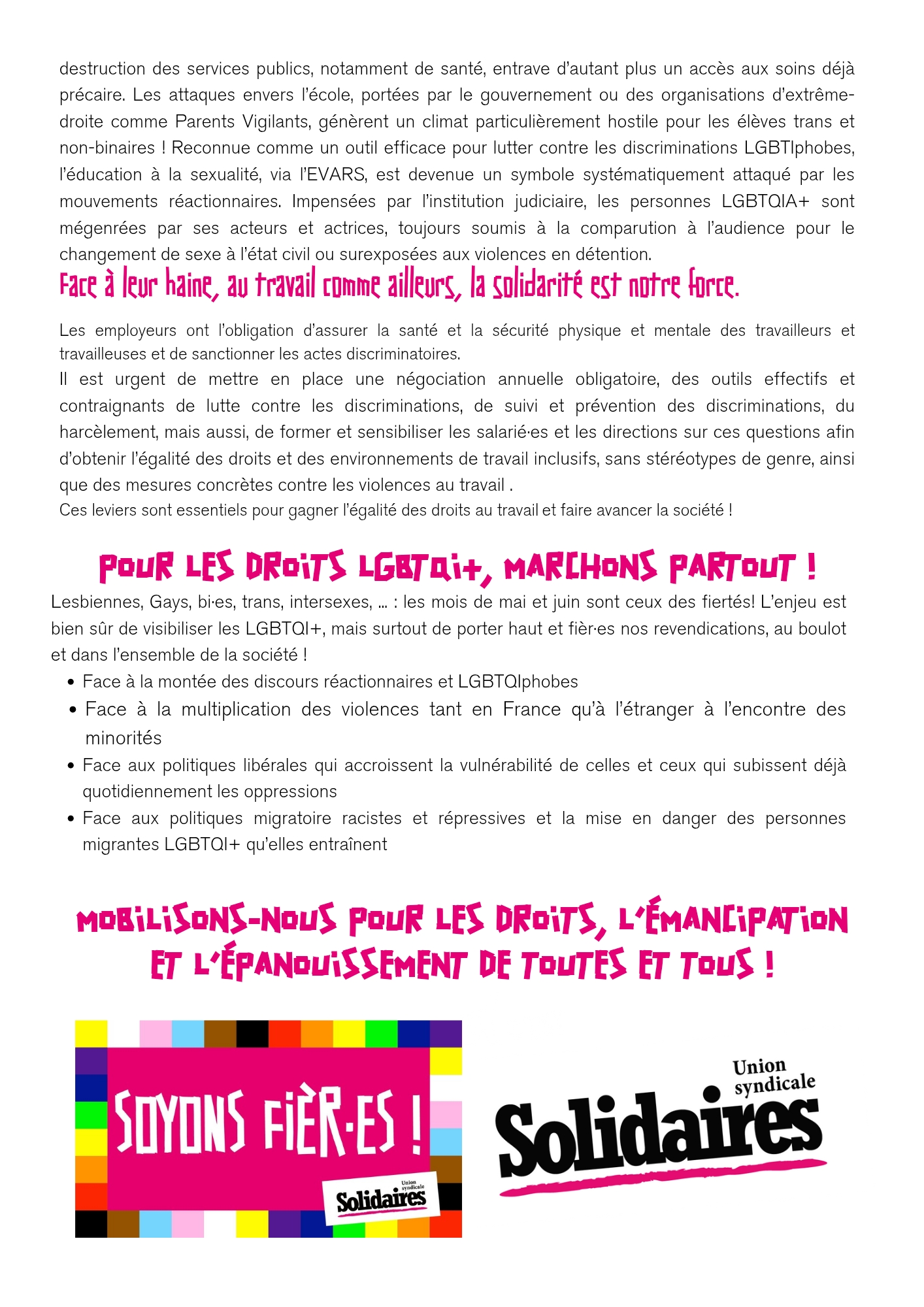 La destruction des services publics, notamment de santé, entrave d’autant plus un accès aux soins déjà précaire. Les attaques envers l’école, portées par le gouvernement ou des organisations d’extrême-droite comme Parents Vigilants, génèrent un climat particulièrement hostile pour les élèves trans et non-binaires ! Reconnue comme un outil efficace pour lutter contre les discriminations LGBTIphobes, l’éducation à la sexualité, via l’EVARS, est devenue un symbole systématiquement attaqué par les mouvements réactionnaires. Impensées par l’institution judiciaire, les personnes LGBTQIA+ sont mégenrées par ses acteurs et actrices, toujours soumis à la comparution à l’audience pour le changement de sexe à l’état civil ou surexposées aux violences en détention.