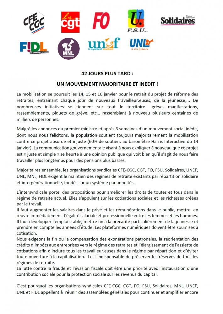 Malgré les annonces du premier ministre et après 6 semaines d’un mouvement social inédit, dont nous nous félicitons, la population soutient toujours majoritairement la mobilisation contre ce projet absurde et injuste (60% de soutien, au baromètre Harris Interactive du 14 janvier). La communication gouvernementale visant à nous expliquer à nouveau que ce projet est « juste et simple » se heurte à une opinion publique qui voit bien qu’il s’agit de nous faire travailler plus longtemps pour des pensions plus basses.