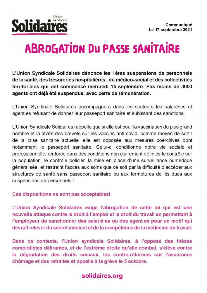 L’Union Syndicale Solidaires dénonce les 1ères suspensions de personnels de la santé, des trésoreries hospitalières, du médico-social et des collectivités territoriales qui ont commencé mercredi 15 septembre. Pas moins de 3000 agents ont déjà été suspendus, avec perte de rémunération.