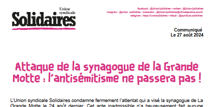 L’Union syndicale Solidaires condamne fermement l’attentat qui a visé la synagogue de La Grande Motte le 24 août dernier. Cet acte inadmissible n’a heureusement fait aucune victime, sauf un policier légèrement blessé. Un drame terrible a été évité de justesse.
