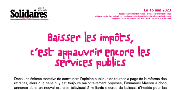 Alors que les cadeaux faits aux riches et aux entreprises sont toujours aussi importants (toujours pas de taxation des superprofits et des superdividendes par exemple), et alors que rien n’est fait pour imposer une hausse des salaires que ce soit dans le public ou le privé, Emmanuel Macron annonce des baisses d’impôts pour les classes moyennes” espérant faire croire à une partie des travailleur-ses à du “plus” en bas de la feuille de paie.