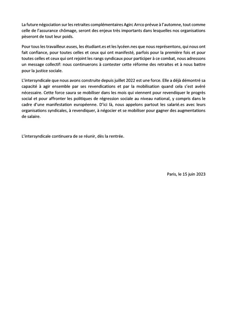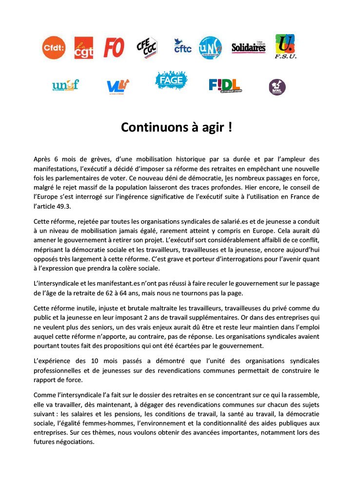 Pour tous les travailleur.euses, les étudiant.es et les lycéen.nes que nous représentons, qui nous ont fait confiance, pour toutes celles et ceux qui ont manifesté, parfois pour la première fois et pour toutes celles et ceux qui ont rejoint les rangs syndicaux pour participer à ce combat, nous adressons un message collectif: nous continuerons à contester cette réforme des retraites et à nous battre pour la justice sociale.