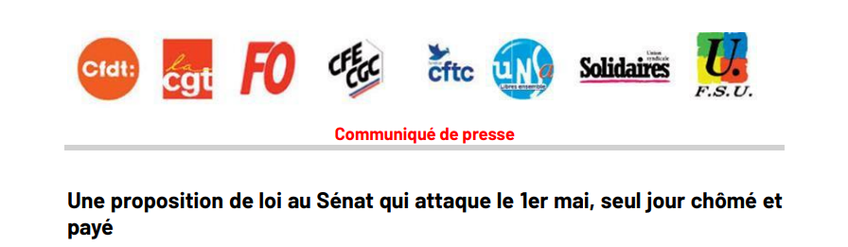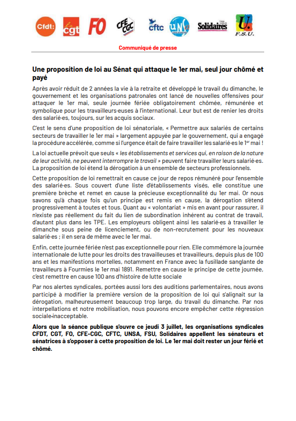 Alors que la séance publique s'ouvre ce jeudi 3 juillet, les organisations syndicales CFDT, CGT, FO, CFE-CGC, CFTC, UNSA, FSU, Solidaires appellent les sénateurs et sénatrices à s’opposer à cette proposition de loi. Le 1er mai doit rester un jour férié et chômé.