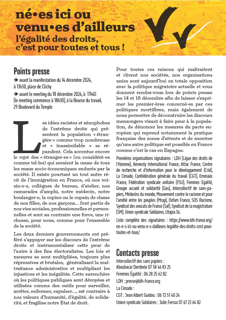Liste complète des signataires : https://www.ldh-france.org/ ne-e-s-ici-ou-venu-e-s-dailleurs-legalite-des-droits-cest-pourtoutes-et-tous/