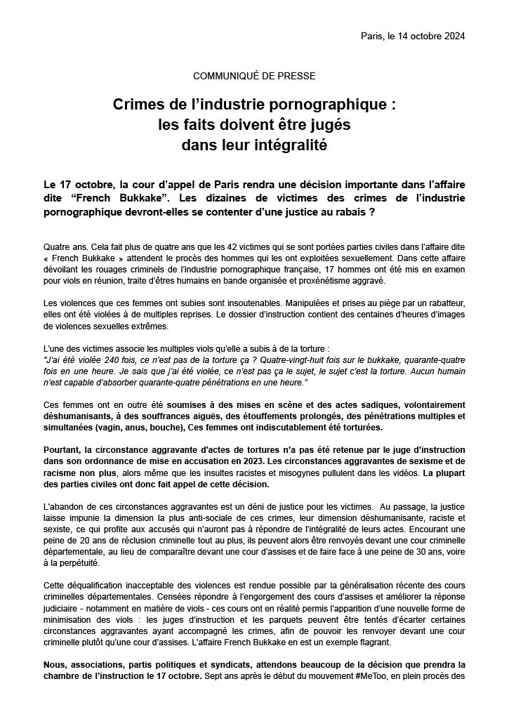Nous, associations, partis politiques et syndicats, attendons beaucoup de la décision que prendra la chambre de l’instruction le 17 octobre. Sept ans après le début du mouvement #MeToo, en plein procès des violeurs de Mazan, nous ne pouvons accepter que les viols soient encore minimisés par l’institution judiciaire et des victimes sacrifiées pour des motifs budgétaires.