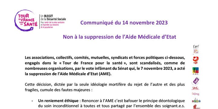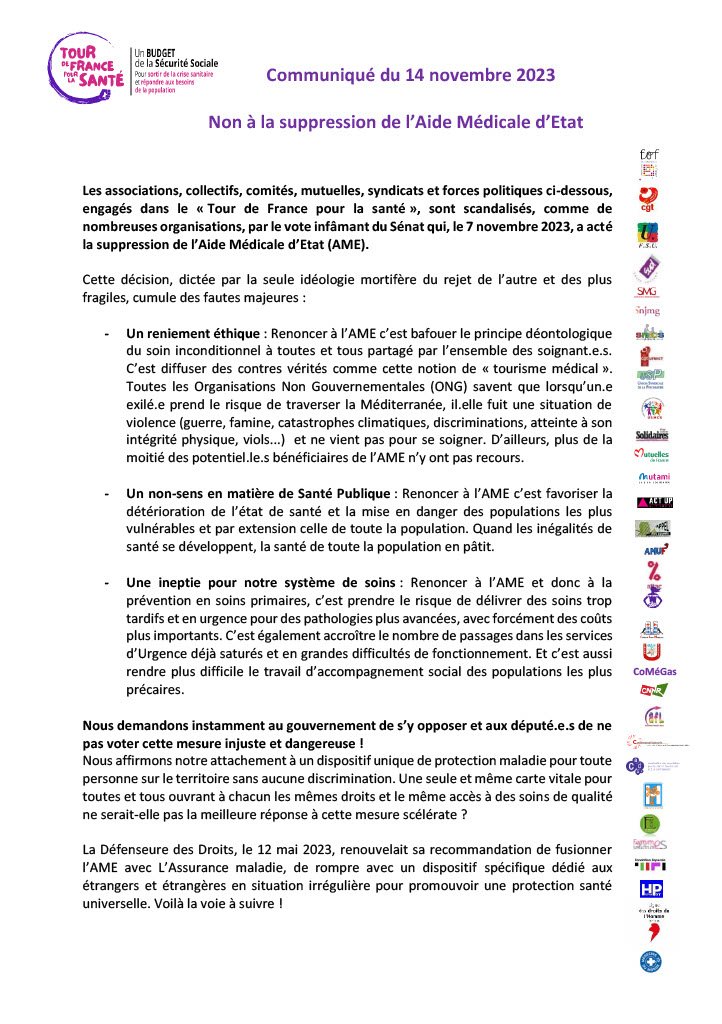 Les associations, collectifs, comités, mutuelles, syndicats et forces politiques ci-dessous, engagés dans le « Tour de France pour la santé », sont scandalisés, comme de nombreuses organisations, par le vote infâmant du Sénat qui, le 7 novembre 2023, a acté la suppression de l’Aide Médicale d’Etat (AME).