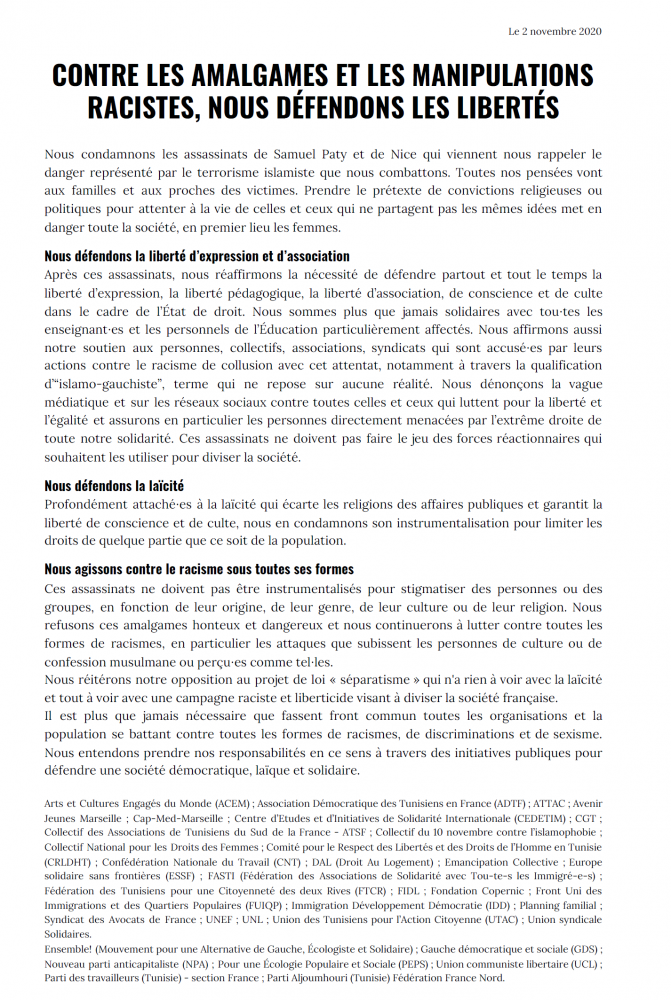 Arts et Cultures Engagés du Monde (ACEM) ; Association Démocratique des Tunisiens en France (ADTF) ; ATTAC ; Avenir Jeunes Marseille ; Cap-Med-Marseille ; Centre d’Etudes et d’Initiatives de Solidarité Internationale (CEDETIM) ; CGT ; Collectif des Associations de Tunisiens du Sud de la France - ATSF ; Collectif du 10 novembre contre l’islamophobie ; Collectif National pour les Droits des Femmes ; Comité pour le Respect des Libertés et des Droits de l’Homme en Tunisie (CRLDHT) ; Confédération Nationale du Travail (CNT) ; Confédération Paysanne ; DAL (Droit Au Logement) ; Emancipation Collective ; Europe solidaire sans frontières (ESSF) ; FASTI (Fédération des Associations de Solidarité avec Tou-te-s les Immigré-e-s) ; Fédération des Tunisiens pour une Citoyenneté des deux Rives (FTCR) ; FIDL ; Fondation Copernic ; Front Uni des Immigrations et des Quartiers Populaires (FUIQP) ; Immigration Développement Démocratie (IDD) ; Planning familial ; Syndicat des Avocats de France ; UNEF ; UNL ; Union des Tunisiens pour l’Action Citoyenne (UTAC) ; Union syndicale Solidaires.