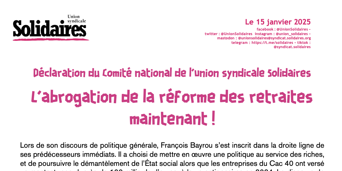 Pour Solidaires, l’abrogation de cette réforme rejetée par la population doit être un préalable indispensable à toute ouverture de négociations sur un meilleur financement par le patronat et l’amélioration du régime de retraites par répartition. Solidaires s’adressera en ce sens aux autres organisations de l’intersyndicale.