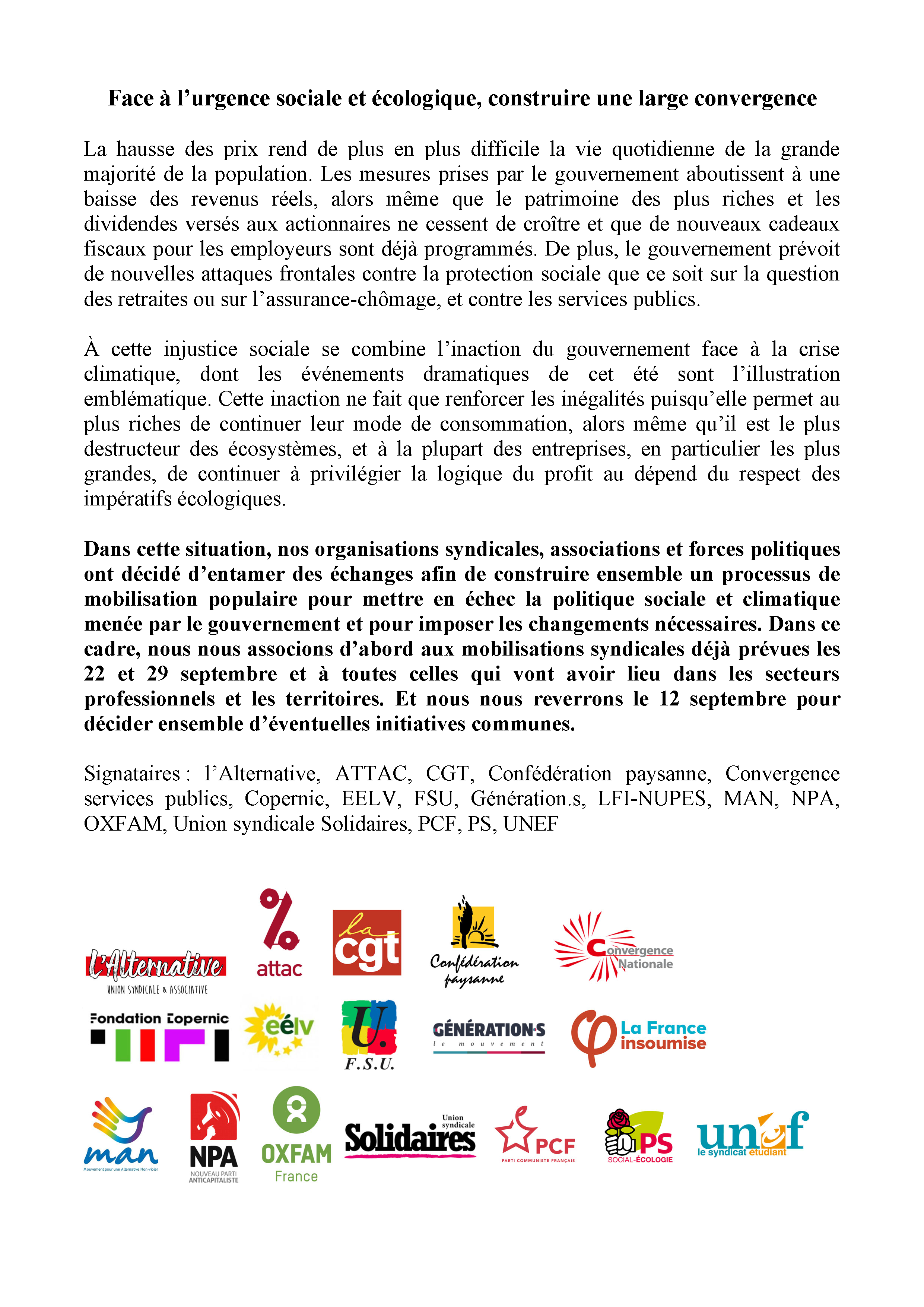 Dans cette situation, nos organisations syndicales, associations et forces politiques ont décidé d’entamer des échanges afin de construire ensemble un processus de mobilisation populaire pour mettre en échec la politique sociale et climatique menée par le gouvernement et pour imposer les changements nécessaires. Dans ce cadre, nous nous associons d’abord aux mobilisations syndicales déjà prévues les 22 et 29 septembre et à toutes celles qui vont avoir lieu dans les secteurs professionnels et les territoires. Et nous nous reverrons le 12 septembre pour décider ensemble d’éventuelles initiatives communes.