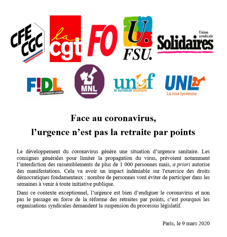 Dans ce contexte exceptionnel, l’urgence est bien d’endiguer le coronavirus et non pas le passage en force de la réforme des retraites par points, c’est pourquoi les organisations syndicales demandent la suspension du processus législatif.
