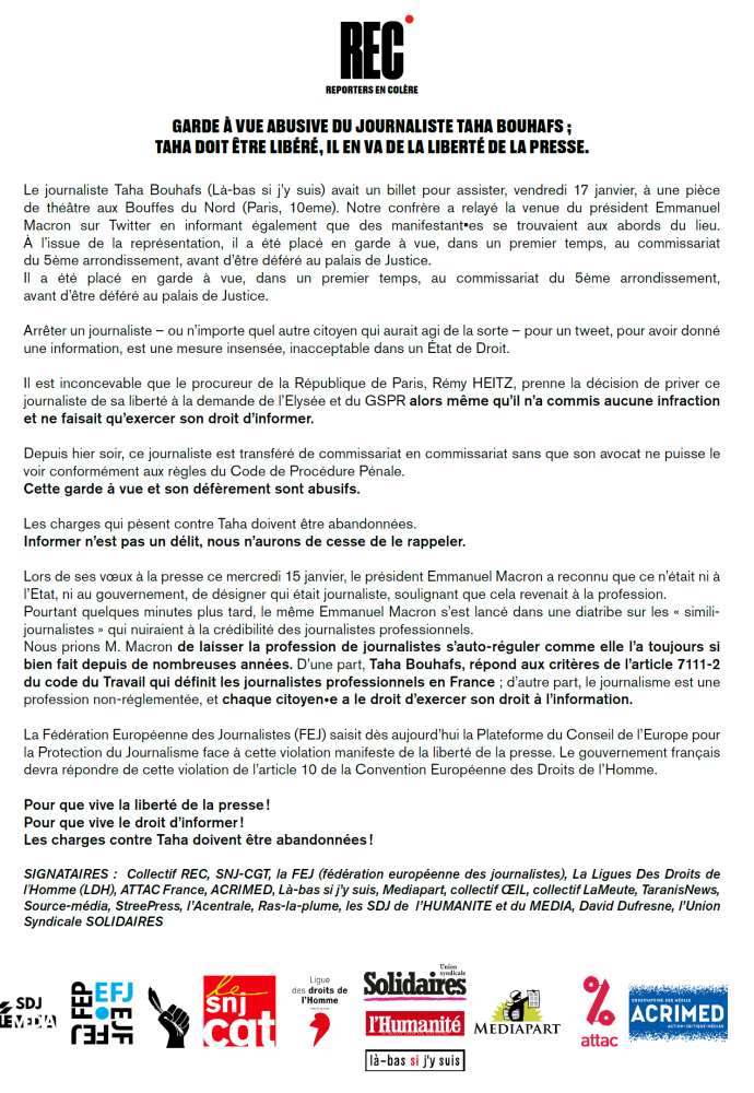 Garde à vue abusive du journaliste TAHA BOUHAFS : TAHA doit être libéré, il en va de la liberté de la presse