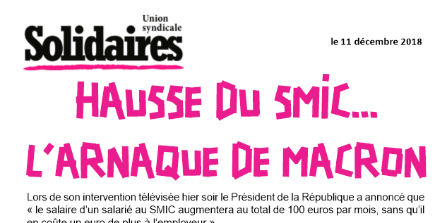 Le SMIC en tant que tel ne bénéficiera d’aucun « coup de pouce » - il sera uniquement revalorisé du montant de la hausse légale automatique déjà prévue (1,8%, soit 20€ environ) - et c’est un resserrement du calendrier de hausse de la prime d'activité (mesure déjà prévue avant les mobilisations actuelles) qui permettra d’atteindre le montant de 100€ annoncé. La prime d'activité est une prestation sociale financée par tous les contribuables (coût zéro pour les entreprises) et elle ne sera revalorisée que de 0,3% en 2019 et 2020...
