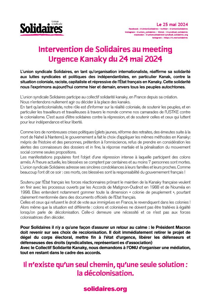L’union syndicale Solidaires, en tant qu’organisation internationaliste, réaffirme sa solidarité aux luttes syndicales et politiques des indépendantistes, en particulier Kanak, contre la situation coloniale, raciste, capitaliste et répressive de l’État français en Kanaky. Cette solidarité nous l’exprimons aujourd’hui comme hier et demain, envers tous les peuples autochtones.