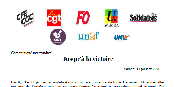 Les 9, 10 et 11 janvier les mobilisations auront été d’une grande force. Ce samedi 11 janvier elles ont pris de l'ampleur avec un caractère interprofessionnel et transgénérationnel marqué. Ces journées marquent une étape importante dans la mobilisation par la grève lancée depuis le 5 décembre.