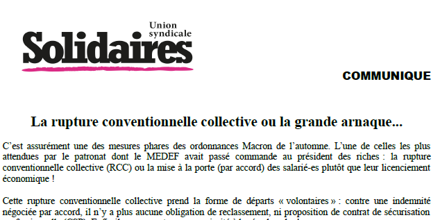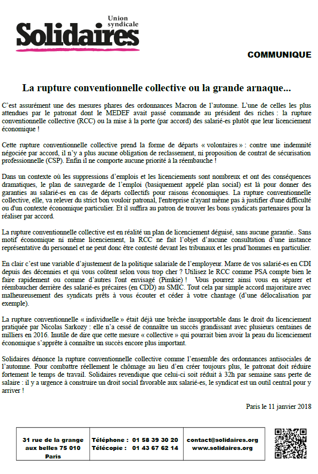 Solidaires dénonce la rupture conventionnelle collective comme l’ensemble des ordonnances antisociales de l’automne. Pour combattre réellement le chômage au lieu d’en créer toujours plus, le patronat doit réduire fortement le temps de travail. Solidaires revendique que celui-ci soit réduit à 32h par semaine sans perte de salaire : il y a urgence à construire un droit social favorable aux salarié-es, le syndicat est un outil central pour y arriver.