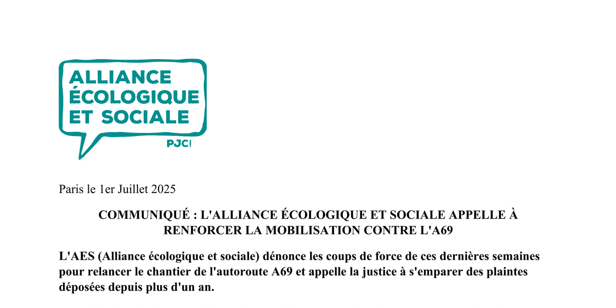 L‘AES (Alliance écologique et sociale) dénonce les coups de force de ces dernières semaines pour relancer le chantier de l’autoroute A69 et appelle la justice à s’emparer des plaintes déposées depuis plus d’un an.