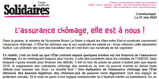 Dans la presse, le ministre de l'économie Bruno Le Maire a réparti les rôles entre Etat et syndicats concernant l'assurance chômage. A l’État les chômeur·ses et aux syndicats les salarié·es ! Nous refusons cette séparation factice. Les chômeur·ses sont des travailleur·ses et c'est donc aux syndicats de les organiser.