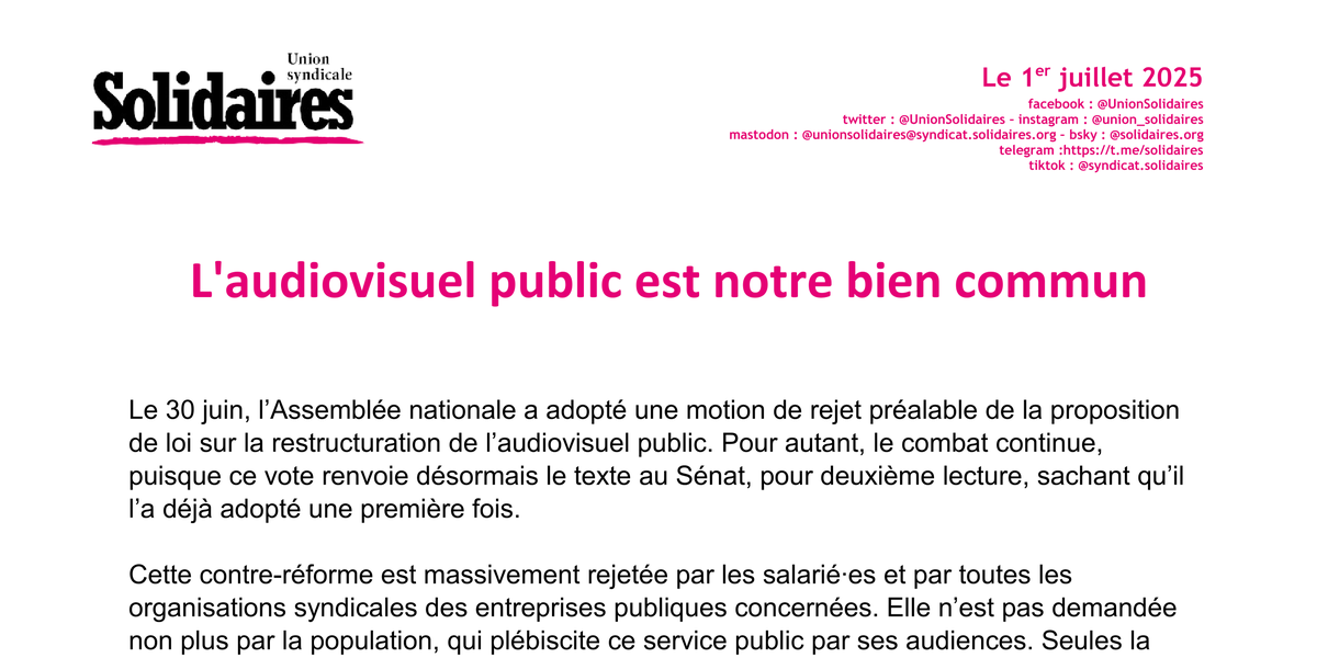 Le 30 juin, l’Assemblée nationale a adopté une motion de rejet préalable de la proposition de loi sur la restructuration de l’audiovisuel public. Pour autant, le combat continue, puisque ce vote renvoie désormais le texte au Sénat, pour deuxième lecture, sachant qu’il l’a déjà adopté une première fois.