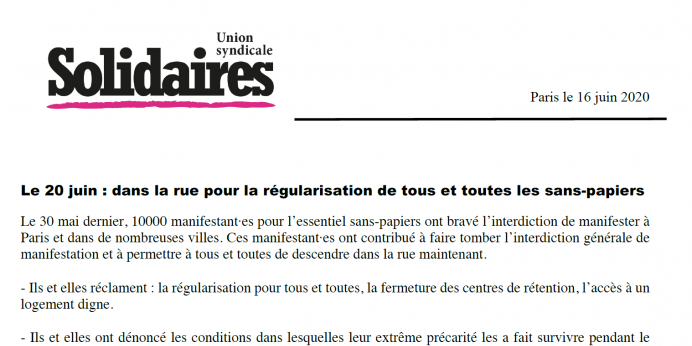 Le 20 juin, dans de nombreuses villes de France, ce sera une nouvelle occasion pour porter ensemble ces revendications. A Paris, la manifestation débutera à 14h de la Place de la Nation et rejoindra le cortège de la manifestation contre le racisme et les violences policières en hommage à Lamine Dieng à Père Lachaise.