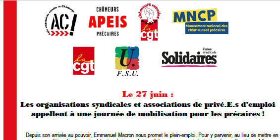 Le 27 juin : Les organisations syndicales et associations de privé.E.s d’emploi appellent à une journée de mobilisation pour les précaires !