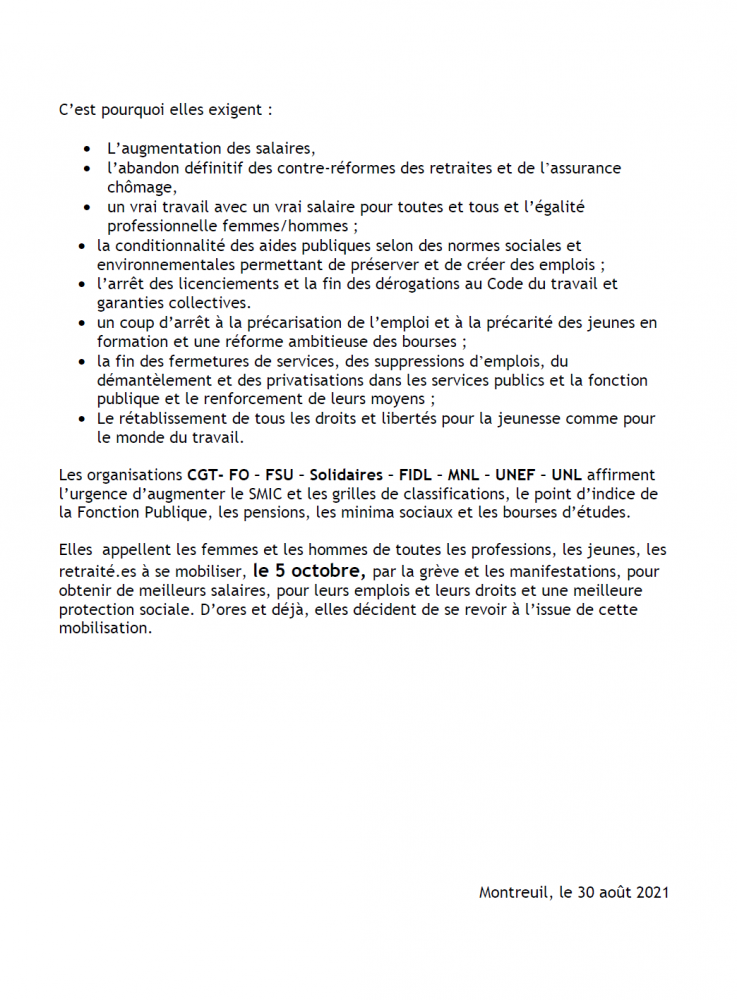 , par la grève et les manifestations, pour obtenir de meilleurs salaires, pour leurs emplois et leurs droits et une meilleure protection sociale. D’ores et déjà, elles décident de se revoir à l’issue de cette mobilisation.Montreuil, le 30 août 2021