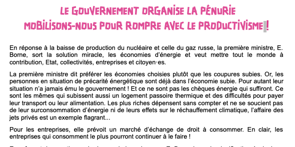 En réponse à la baisse de production du nucléaire et celle du gaz russe, la première ministre, E. Borne, sort la solution miracle, les économies d’énergie et veut mettre tout le monde à contribution, Etat, collectivités, entreprises et citoyen·es.