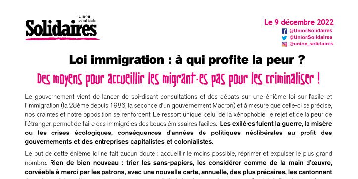 Solidaires continuera partout à dénoncer cette politique de l'immigration jetable, et appelle à construire un cadre unitaire large pour revendiquer haut et fort, toutes et tous ensemble, la liberté de circulation et d'installation avec une véritable politique d'accueil.