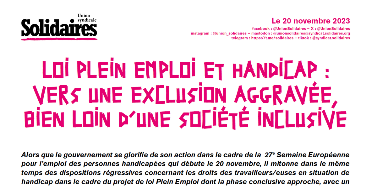 Loi Plein Emploi et handicap : vers une exclusion aggravée, bien loin d’une société inclusive Alors que le gouvernement se glorifie de son action dans le cadre de la 27ème Semaine Européenne pour l’emploi des personnes handicapées qui débute le 20 novembre, il mitonne dans le même temps des dispositions régressives concernant les droits des travailleurs/euses en situation de handicap dans le cadre du projet de loi Plein Emploi dont la phase conclusive approche, avec un texte remanié par la commission mixte paritaire du Parlement le 23 octobre, texte qui est en train d’être soumis au vote de l’assemblée nationale et du sénat.