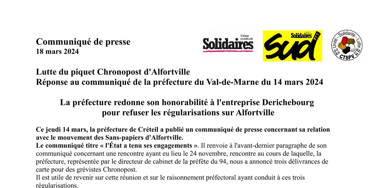 Lutte du piquet Chronopost d'Alfortville Réponse au communiqué de la préfecture du Val-de-Marne du 14 mars 2024