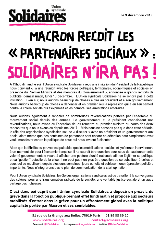 A 19h30 dimanche soir, l’Union syndicale Solidaires a reçu une invitation du Président de la République nous conviant « à une réunion avec les forces politiques, territoriales, économiques et sociales en présence du Premier Ministre et des membres du Gouvernement », annoncée à grands renforts de publicité, demain matin, lundi 10 décembre.