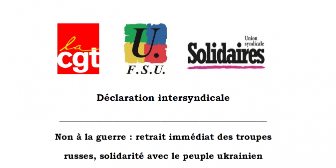 Nos organisations, CGT, FSU et Solidaires, condamnent l'invasion de l'Ukraine par les armées russes, en violation de la souveraineté ukrainienne et de la charte des Nations Unies. La responsabilité de la guerre en cours incombe à Vladimir Poutine et à son régime : sa décision fait basculer les relations internationales dans une période instable et dangereuse. Une paix durable en Europe de l'Est passe par un retrait immédiat des troupes russes du sol ukrainien et le retour à la diplomatie afin de dégager une solution respectueuse des droits des peuples.